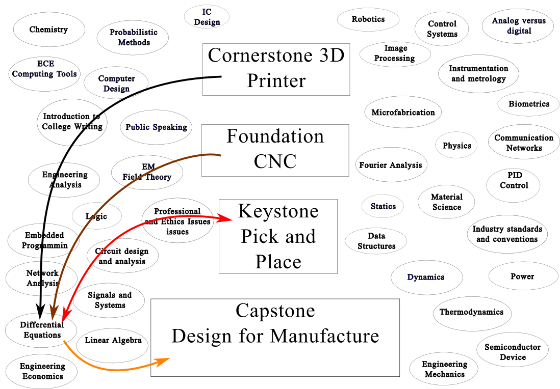 We strive to hit every subject in the engineering curriculum with this golden rule of three. In fact, this is how the four BUILD classes and their projects were designed. We took every major concept in the EE curriculum and mapped it twice into the projects – once as pre-class interest exposure and once as a post-class experiential exposure. The goal was to enhance every single class in the curriculum without changing the classes themselves. Figure 1 shows the mapping for differential equations. As freshman, the students attend design reviews for the sophomore and junior projects, seeing the product of the differential equation tool. Here, depicted by the black arrow, they see how much faster and smoother the junior pick and place machine runs than the sophomore and freshman machines. They see how PID control works and understand that if they just knew differential equations they can do this. As sophomores, as depicted in the brown arrow, they take the differential equations and get a deep, motivated dive into the subject. As juniors, they design, build, test, and perfect their pick and place machines and use differential equations. They’re still learning about them as depicted by the bidirectional red arrow. As Seniors they are using and teaching them as depicted in orange. In this way the four flagship courses enhance every single class in their academic career without changing the classes themselves.